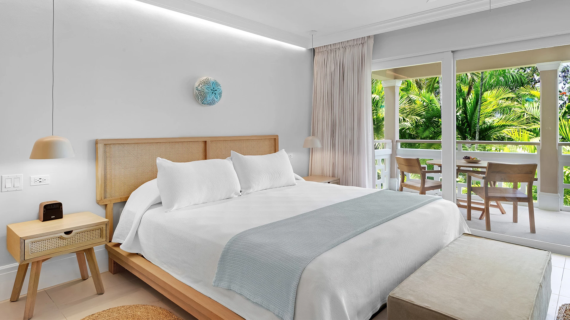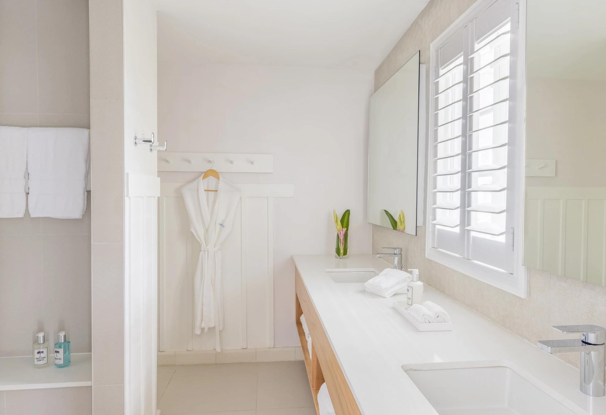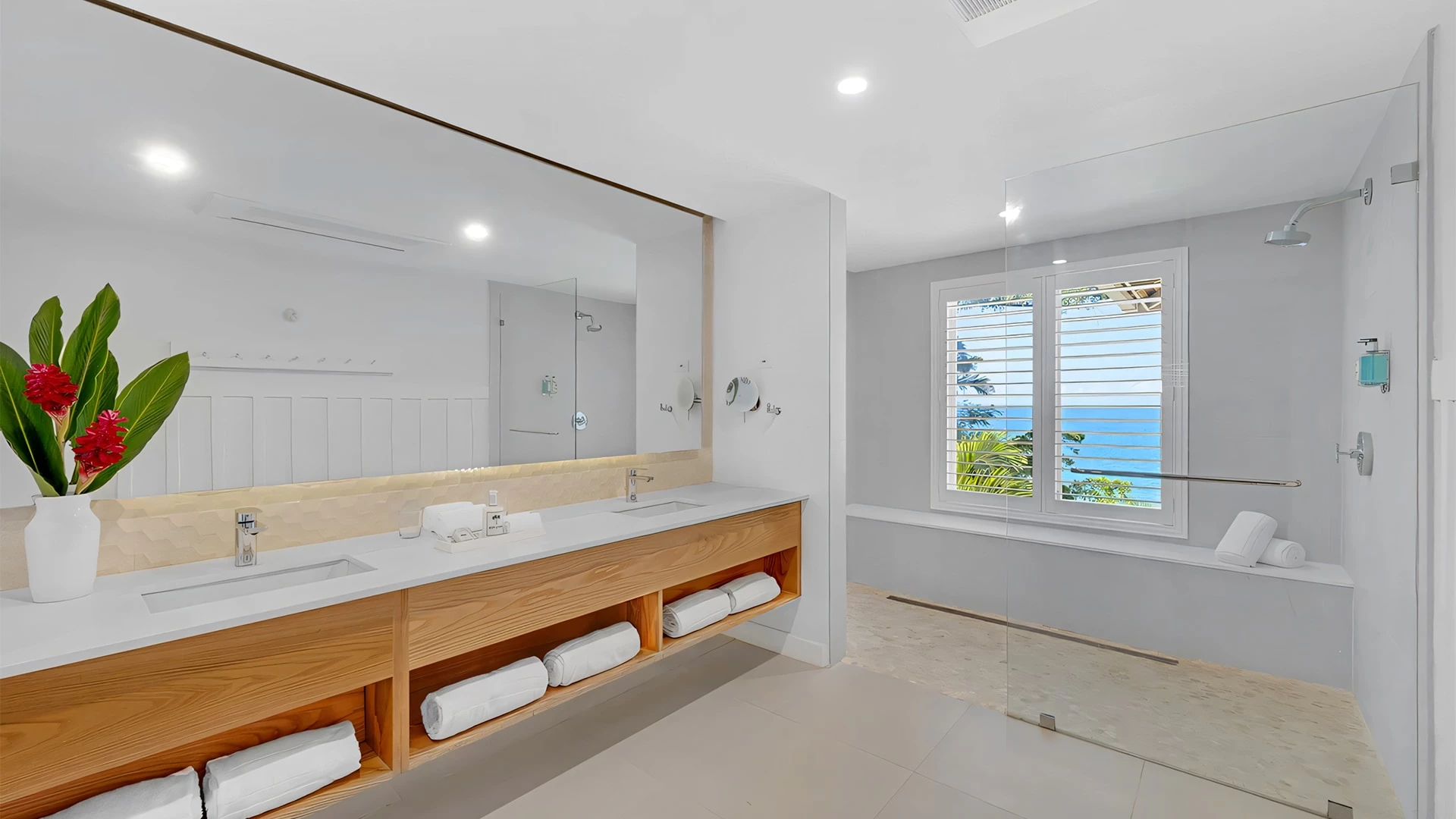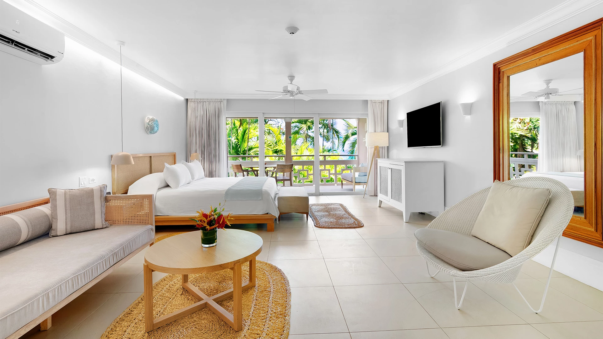 Tür auf, Tropen an. Zwischen Blätterschimmer und Vogelstimmen wirken diese Suiten wie ein privater Gartenpavillon. Sanfte Pastelltöne, helle Hölzer und geflochtene Details schaffen sofort dieses „Hier bleiben“-Gefühl. Große Schiebetüren öffnen sich zu privaten Balkonen mit echtem Regenwaldgefühl. Begehbare Duschen, mit elegantem italienischem Porzellan gefliest, setzten einen edlen Akzent. Lage: Gebäude C, D, E und G.