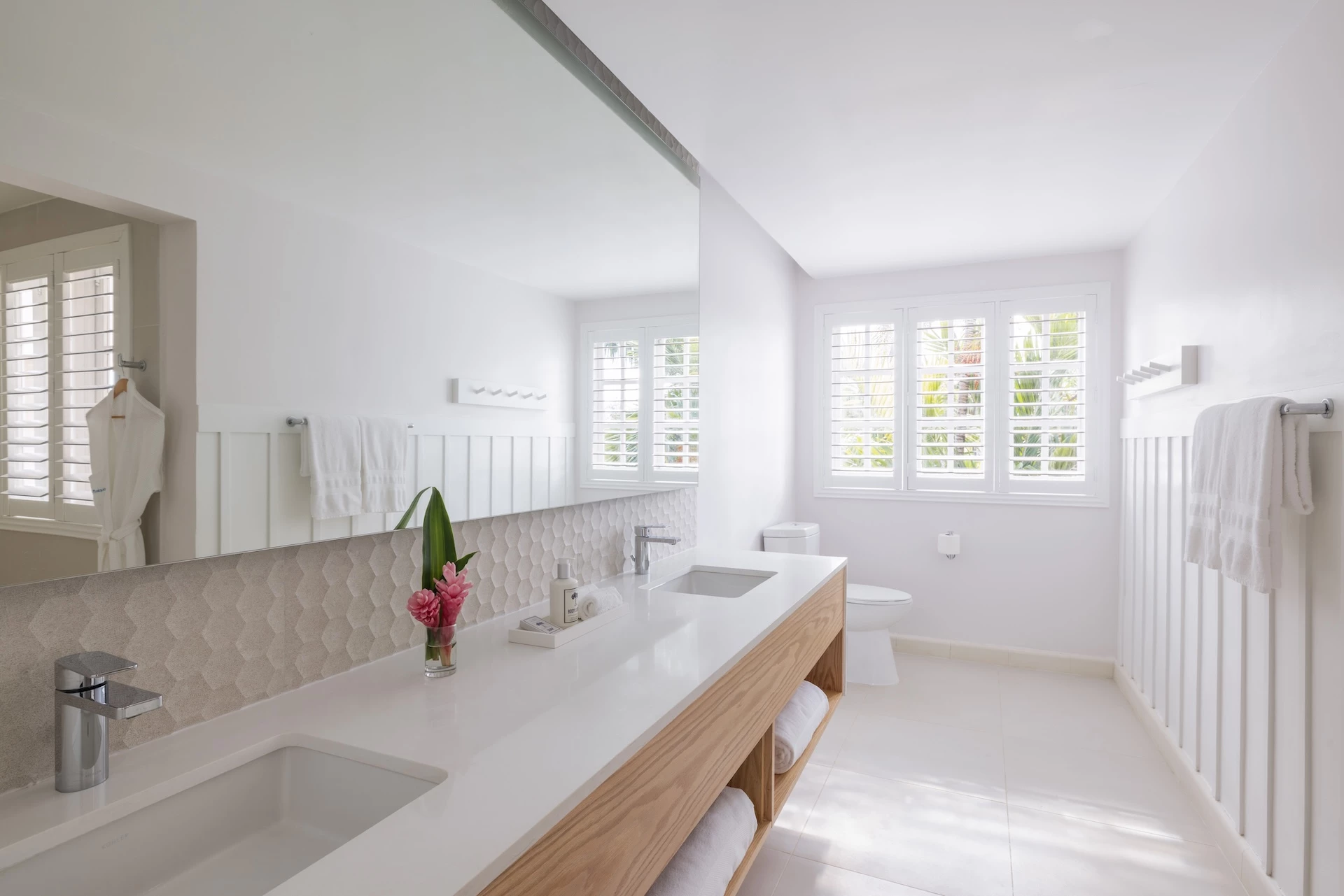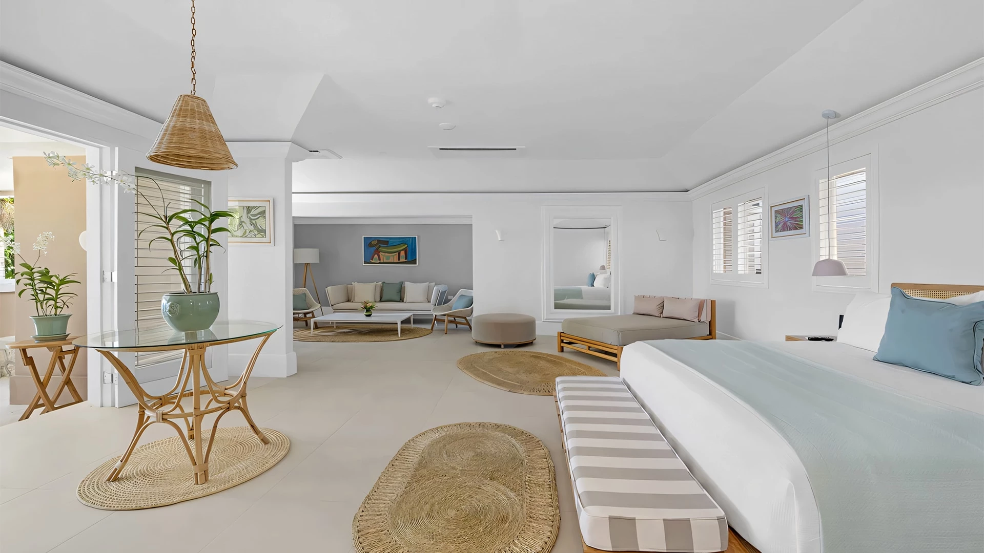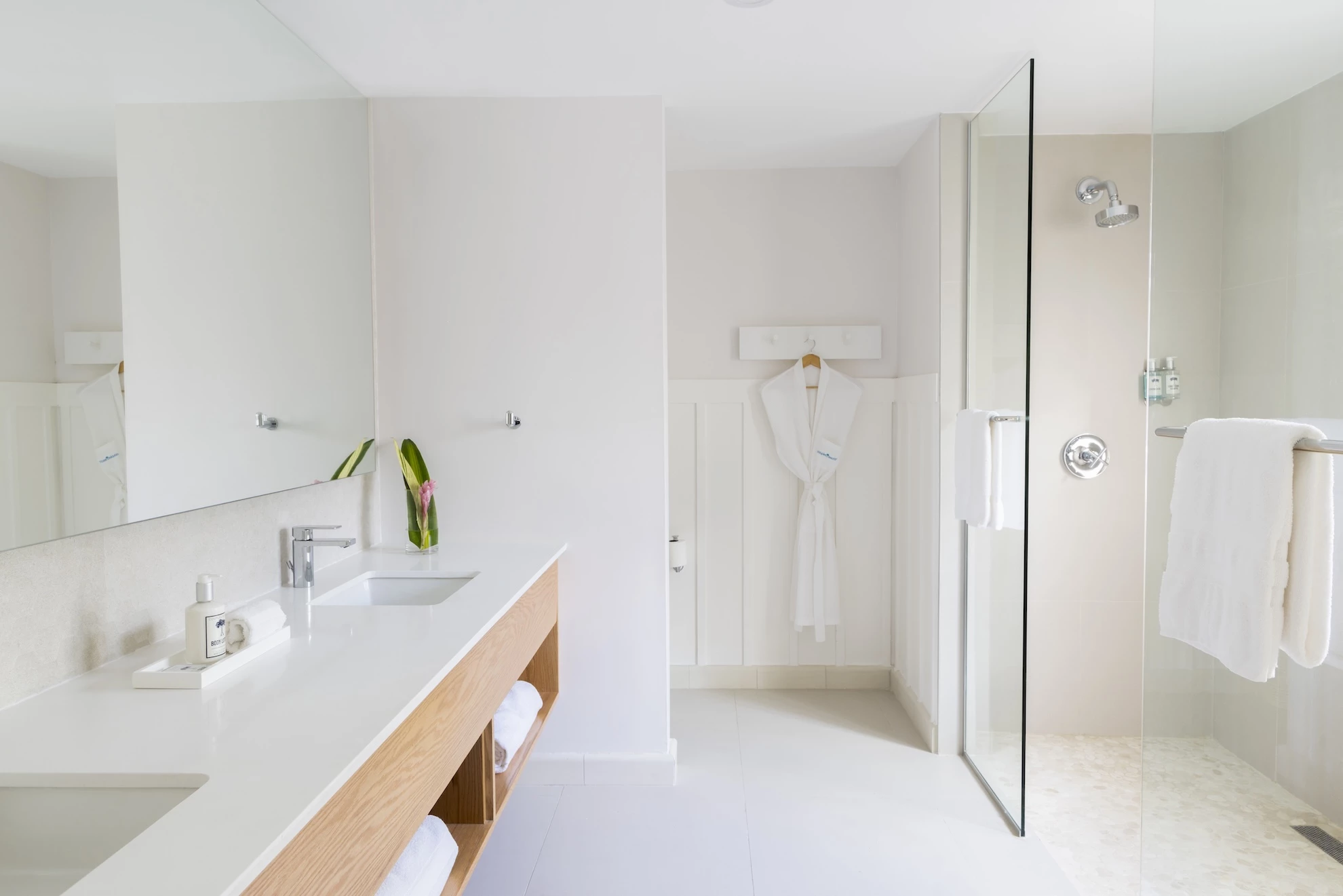 Tür auf, Tropen an. Zwischen Blätterschimmer und Vogelstimmen wirken diese Suiten wie ein privater Gartenpavillon. Sanfte Pastelltöne, helle Hölzer und geflochtene Details schaffen sofort dieses „Hier bleiben“-Gefühl. Große Schiebetüren öffnen sich zu privaten Balkonen mit echtem Regenwaldgefühl. Begehbare Duschen, mit elegantem italienischem Porzellan gefliest, setzten einen edlen Akzent. Lage: Gebäude C, D, E und G.