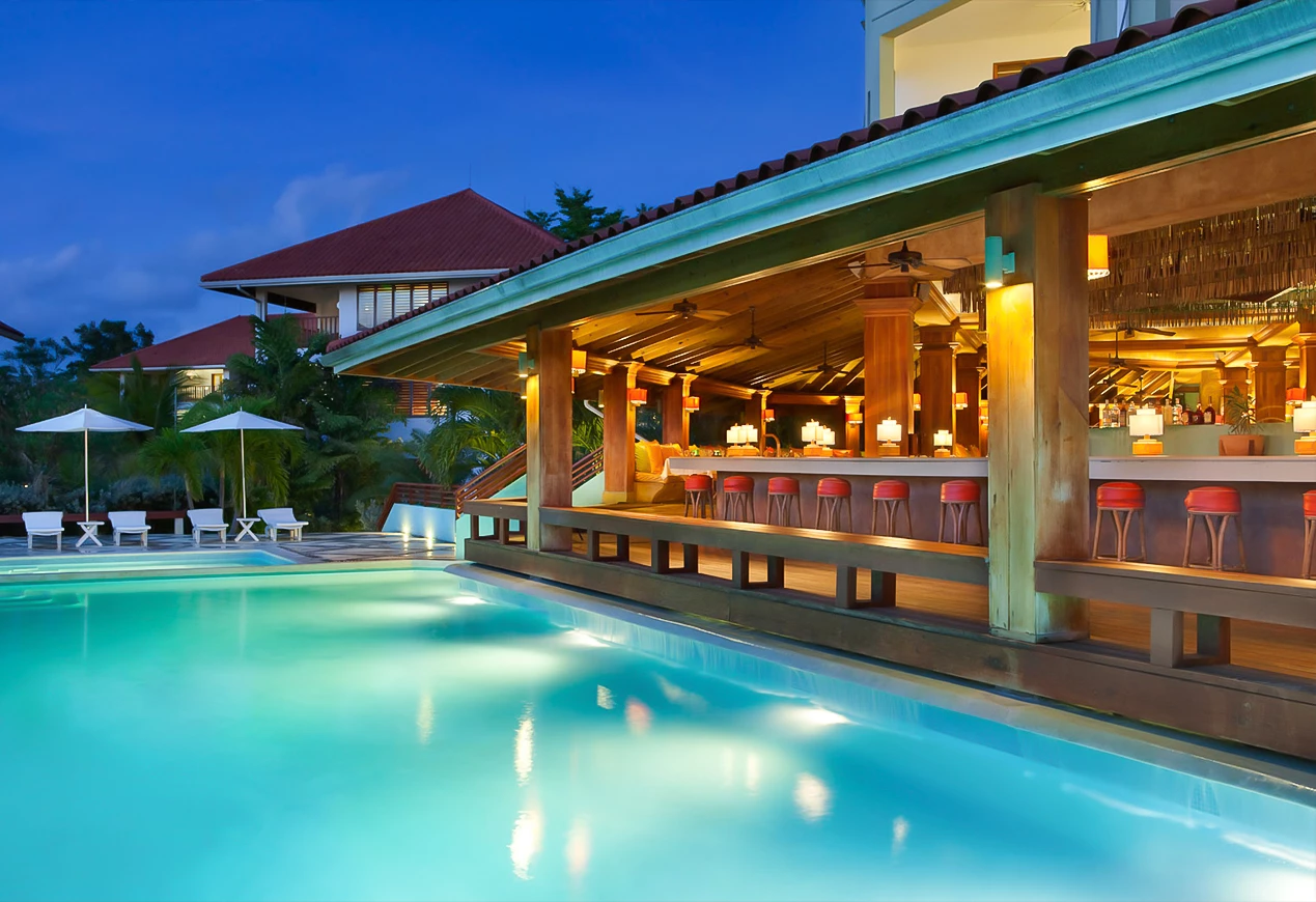 Unsere stilvolle Patois Bar mit Blick auf den Pool ist der perfekte Ort für einen Cocktail vor dem Abendessen.