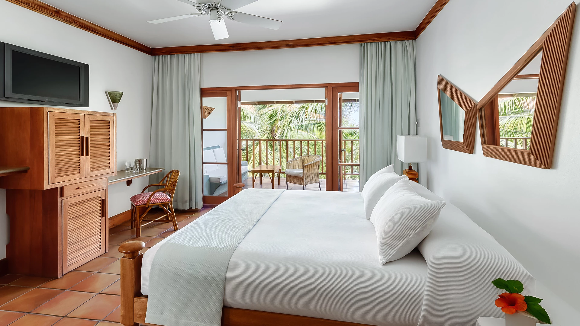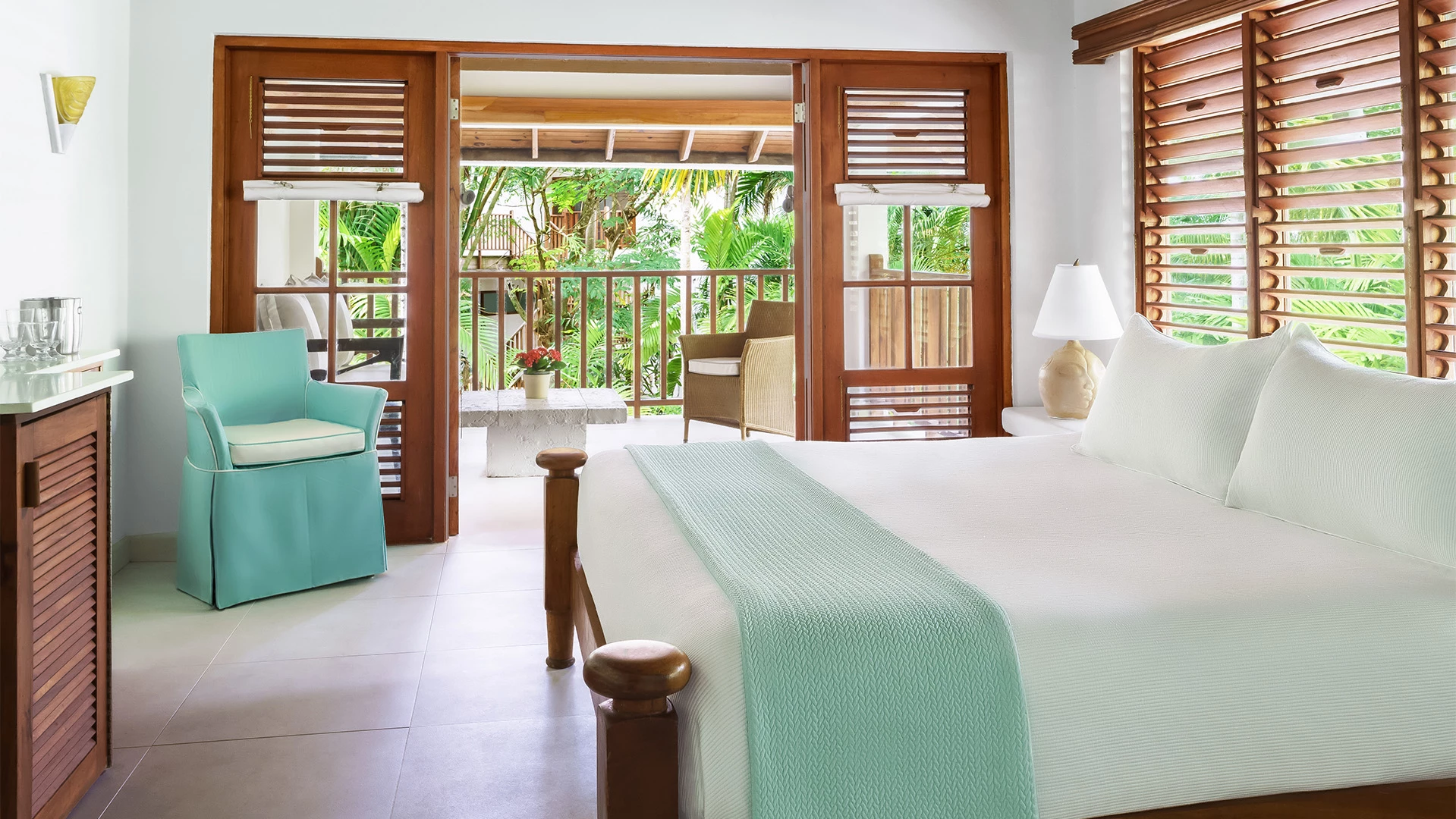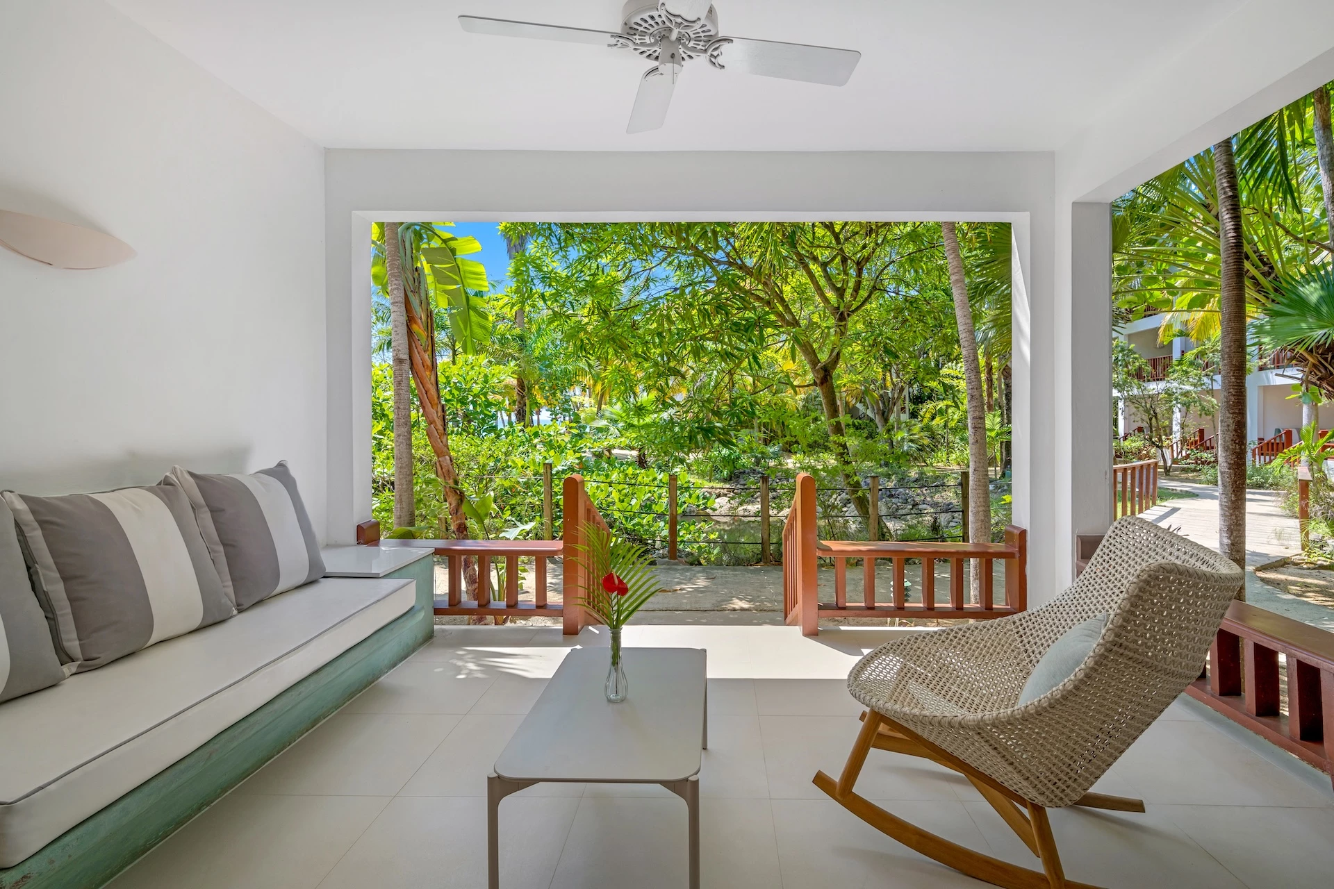 Mit Blick auf die üppigen, tropischen Gärten des Resorts verfügen diese Zimmer über einen eigenen, möblierten Balkon, Terrakottafliesen sowie französische Türen mit Zedernholz-Läden. Die Suiten befinden sich in unmittelbarer Nähe des Eingangs und der Straße.