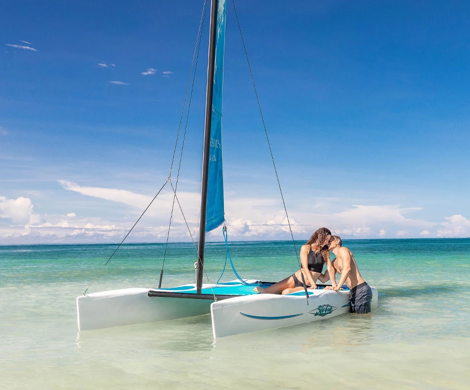 Spüren Sie die karibische Brise und die Vorfreude an Bord einer romantischen Katamaranfahrt* mit Rum Punch und einem Sprung ins Meer direkt vom Schiff. Bis zu viermal pro Woche heißt es: Segel setzen!